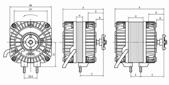 | 型號 | 額定電壓 | 頻率 | 輸入功率 | 輸出功率 | 額定電流 | 轉速 | A mm | B mm | C mm | D mm | E mm | H mm |