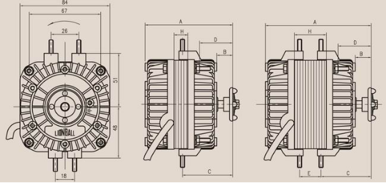 該款電機裝有兩個支架安裝角,一側的螺絲間距為18mm,與之相對應的一側螺絲間距為26mm。根據電機鐵芯厚度和繞線參數的不同,共有輸出功率為3W到34W等9種型號的電機供客戶選擇。額定電壓有220~240V,50/60Hz和 110~115V,50/60Hz兩種。對於客戶需求的不同的引出線長度、前後端蓋的樣式、後端蓋是否帶螺紋孔、特殊的使用環境等均能按要求設計定做。為最大限度的發揮電機性能,我司可提供風葉、安裝支架、網罩、法蘭等產品附件,購買前請詳細說明風葉氣流風向和傾斜角度。產品可作為商業冷櫃冷庫、製冰機、冷風機、冷水機、冷凝機組、中央空調、取暖器、啤酒機、攪拌機等設備的理想配套產品。